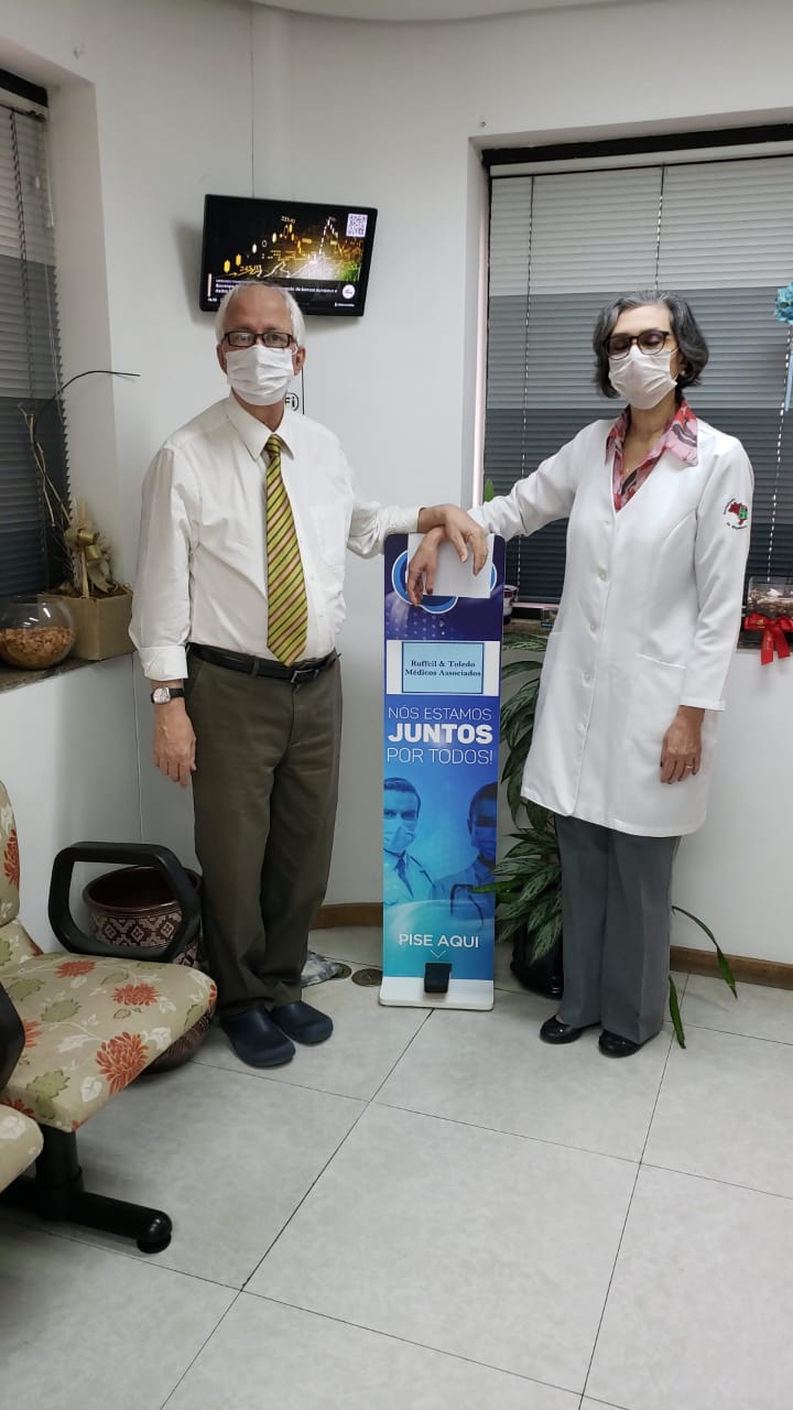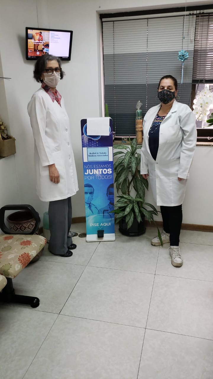 TOTEM de Álcool Gel na recepção e frascos no consultório: